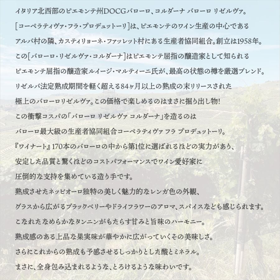 [コーペラティヴァ・フラ・プロデュットーリ]は、ピエモンテのワイン生産の中心であるアルバ村の隣、カスティリョーネ・ファッレット村にある生産者協同組合。 創立は1958年。 この[バローロ・リゼルヴァ・コルダーナ]はピエモンテ屈指の醸造家として知られるピエモンテ屈指の醸造家ルイージ・マルティーニ氏が、最高の状態の樽を厳選ブレンド。 リゼルバ法定熟成期間を軽く超える84ヶ月以上の熟成の末リリースされた極上のバローロリゼルヴァ。