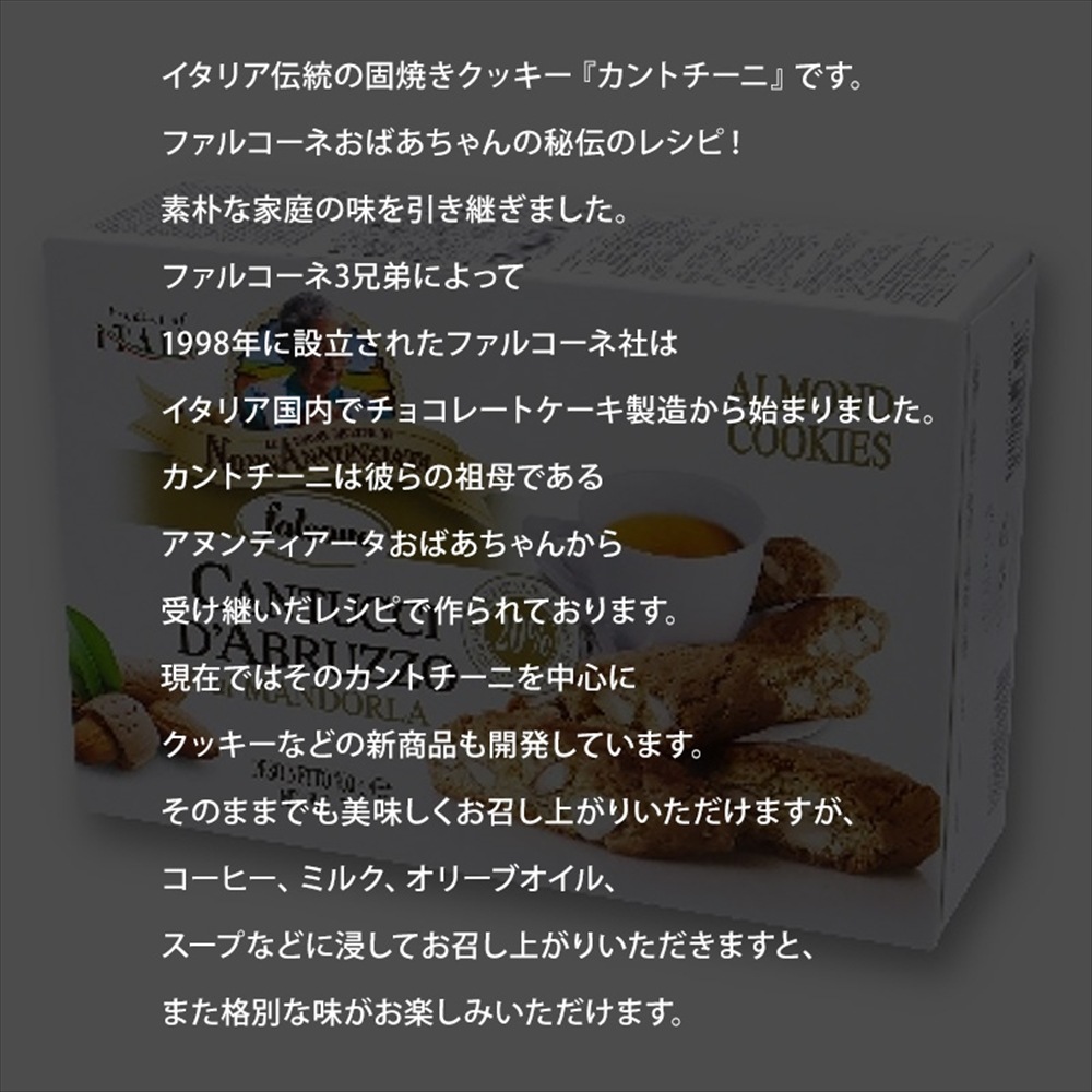 ファルコーネおばあちゃんの秘伝のレシピ! 素朴な家庭の味を引き継ぎました。 ファルコーネ3兄弟によって1998年に設立されたファルコーネ社はイタリア国内でチョコレートケーキ製造から始まりました。 カントチーニは彼らの祖母であるアヌンティアータおばあちゃんから受け継いだレシピで作られております。 現在ではそのカントチーニを中心にクッキーなどの新商品も開発しています。